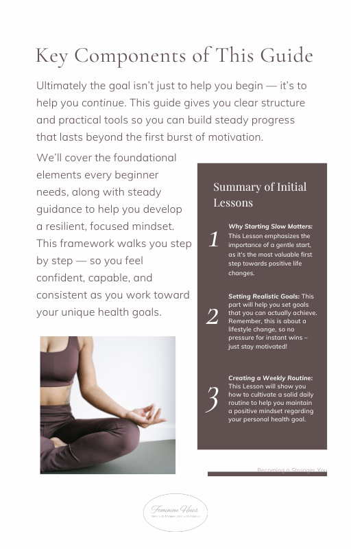 This self-guided framework helps women build consistent progress through regulated pacing, foundational movement, and disciplined repetition.